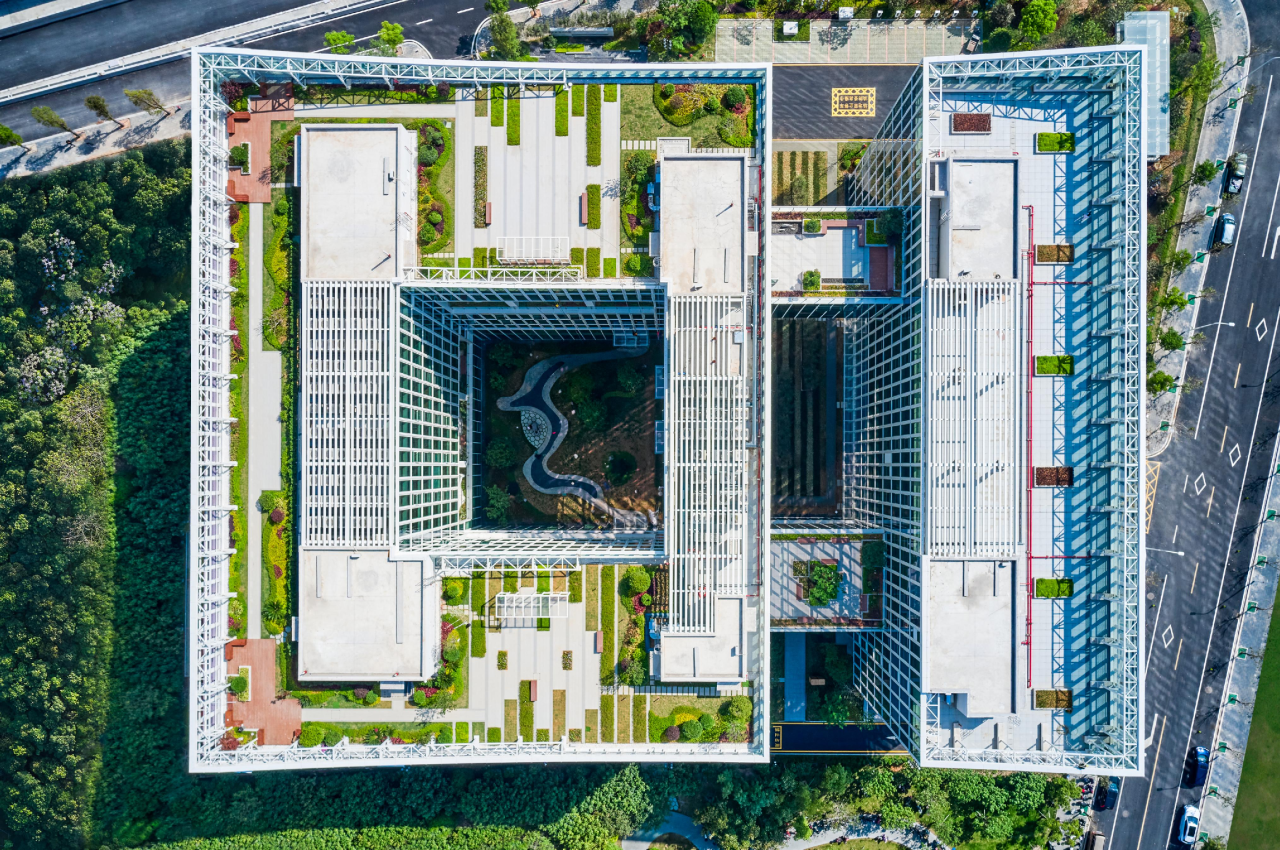 為恢復(fù)場(chǎng)地生態(tài)環(huán)境,該項(xiàng)目結(jié)合了海綿城市設(shè)計(jì),建設(shè)雨水花園、透水鋪裝、雨水回用池等雨水利用設(shè)施,讓年徑流總量控制率達(dá)到82%以上。同時(shí),采取了多種措施降低熱島環(huán)境效應(yīng),營(yíng)造宜居微氣候環(huán)境,包括進(jìn)行場(chǎng)地整體綠化設(shè)計(jì),在總平面、中心天井庭院、開(kāi)敞平臺(tái)、屋頂設(shè)置花園綠化,建筑首層結(jié)合僑鄉(xiāng)風(fēng)貌建筑設(shè)置可利于遮陰、人員活動(dòng)的騎樓空間,提供了立體、全方位的景觀(guān)資源,活躍了商務(wù)辦公氛圍。