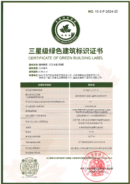 新區(qū)·三江大廈由福州新區(qū)集團(tuán)投資建設(shè),福建建科院提供綠建專(zhuān)業(yè)咨詢(xún),獲評(píng)2024年住建部第一批三星級(jí)綠色建筑標(biāo)識(shí)認(rèn)證,是2019年綠標(biāo)V3.0版以來(lái)福建省唯一入選國(guó)家住建部三星級(jí)認(rèn)證的項(xiàng)目,并成功成為福建省首個(gè)三星級(jí)綠色建筑標(biāo)識(shí)認(rèn)證項(xiàng)目。