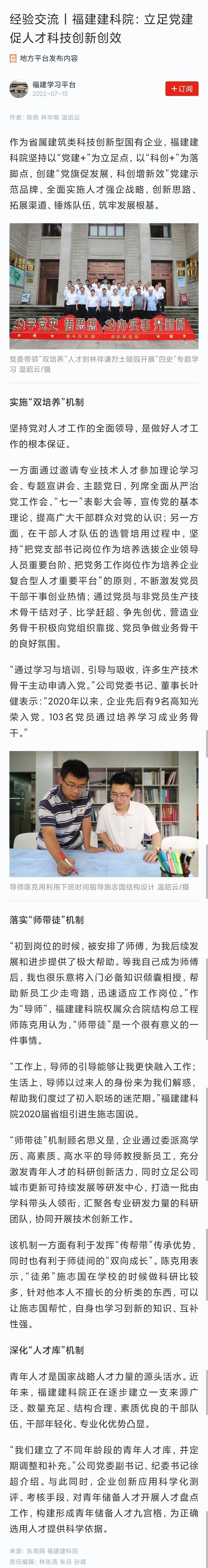紅七月,福建建科院黨建促發(fā)展的舉措及成效獲主流媒體關(guān)注報(bào)道。7月15日,學(xué)習(xí)強(qiáng)國(guó)福建學(xué)習(xí)平臺(tái)刊發(fā)題為《經(jīng)驗(yàn)交流丨福建建科院:立足黨建 促人才科技創(chuàng)新創(chuàng)效》的文章。